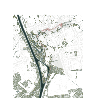 A central element of the master plan is the blue-green ribbon that links the various zones. The ribbon follows the natural structure of the landscape and creates a slow-paced network for walkers and cyclists. In the recreational area, a fully accessible experiential path was designed that crosses the habitat of the tree frog. The path network was conceived so that recreation, mobility, nature experience, and ecological carrying capacity go hand in hand.